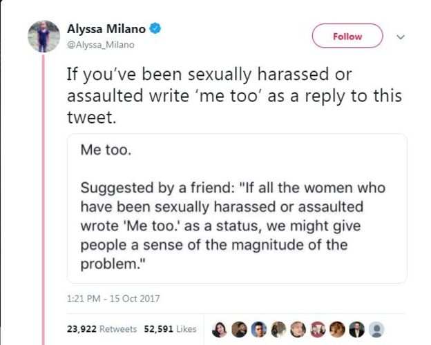 أول من أطلقت هاشتاغ “مي تو” في أواخر عام 2017، كانت الممثلة الأمريكية أليسا ميلانو، التي ادعت تحرش المخرج الأمريكي هارفي واينستين جنسياً بها. ودعت من خلال الهاشتاغ ” أنا أيضاً” جميع النساء اللواتي تعرضن للتحرش الجنسي إلى الإفصاح عن تجاربهن وإرفاقها بالهاشتاغ. واستجابت المئات من النساء حول العالم لهذا الهاشتاغ وطالبن بوضع حد لهذا السلوك.