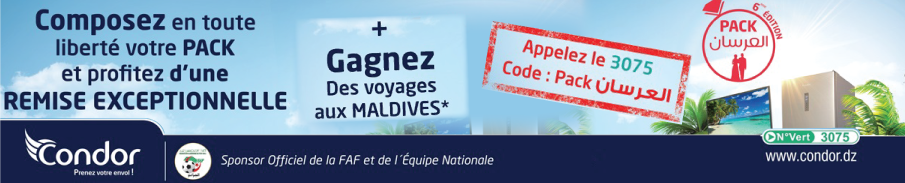 A cet effet, le Groupe Condor propose une fois de plus son Pack sur mesure, et ce, pour la sixième année consécutive. Pour cette année, le client aura la possibilité de composer lui-même son pack et acquérir uniquement les produits qui lui conviennent. Pour tout achat d’un ou plusieurs produits à partir de 130 000 DA, le client bénéficiera de 7% de remise et pourra participer à la Tombola pour gagner un des sept voyages pour deux personnes aux Maldives.