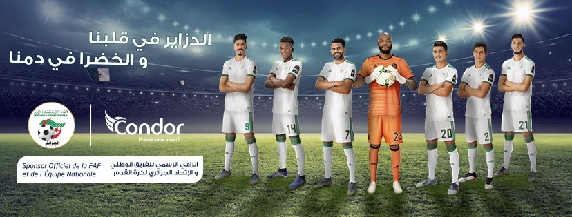 Après la qualification amplement méritée de l’Equipe Nationale de football à la finale de la Coupe d’Afrique des Nations 2019, Condor, Sponsor officiel de l’Equipe Nationale et de la Fédération Algérienne de Football (FAF), adresse ses plus chaleureuses félicitations aux Verts.