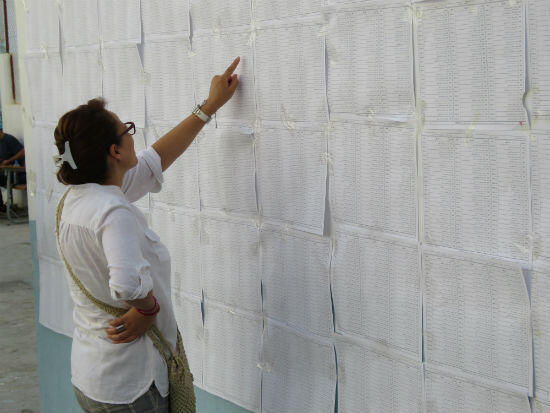 À huit heures tapantes, le centre de vote s’ouvre et la petite foule s’engouffre dans l’école. Après avoir cherché leur nom dans la longue liste des inscrits, les électeurs se répartissent entre les 11 bureaux de vote que compte l’école Ferhat Hached, du nom d’un emblématique syndicaliste tunisien. Les électeurs doivent se présenter un par un, signer le registre, s’encrer le doigt, faire leur choix dans un petit isoloir avant de pouvoir enfin glisser leur bulletin dans l’urne.