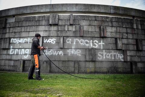 L’inscription «Était un raciste» a été taguée sous le nom du célèbre dirigeant conservateur, accusé d’avoir tenu des propos racistes, notamment contre les Indiens.