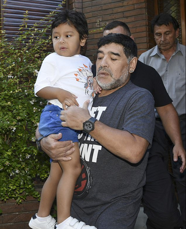 وقال مارادونا في التسجيل لـ “ماريو بودري” الزوج الجديد لوالدة الصبي: “اعتن بها واعتن بملاك الذي لا يضاهى في جماله شيئا”. وتم نشر التسجيل من قبل الصحفي الأرجنتيني لويس فينتورا في برنامج دردشة أمريكي.