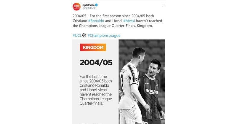 ووفقا لما ذكرته شبكة “أوبتا” للإحصائيات في تغريدة لها على حسابها في موقع تويتر، فإن هذه هي المرة الأولى التي يغيب فيها اللاعبان ميسي ورونالدو معا عن منافسات ربع نهائي بطولة دوري أبطال أوروبا منذ ما يزيد على 16 عاما، أي منذ بطولة التشامبيونزليغ لموسم 2004/2005.
