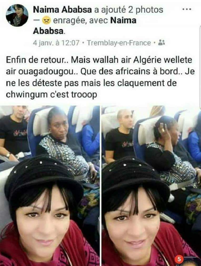 انتقدت، الفنانة نعيمة عبابسة، المتفاعلين مع منشورها الأخير، حول الأفارقة الذين رافقوها في رحلة جوية من ولاية ورقلة نحو العاصمة، وقالت بأن منشورها بعيد كل البعد عن العنصرية وأنه ليست لديها أي مشاكل مع الأفارقةوأنما مشكلتها الوحيدة في طريقة “مضغهم للعلكة”.
