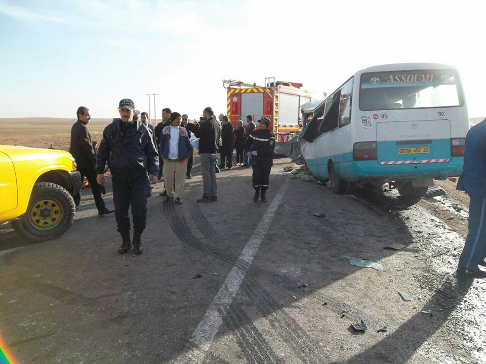 وحسب بيان لمصالح الحماية المدنية، فإن الحادث وقع على الساعة 15 و 20 دقيقة بين حافلة صغيرة لنقل المسافرين وسيارة أجرة بالطريق الوطني رقم 6، بالمكان المسمى سفيد ببلدية سيد أحمد، دائرة عين الحجر.
