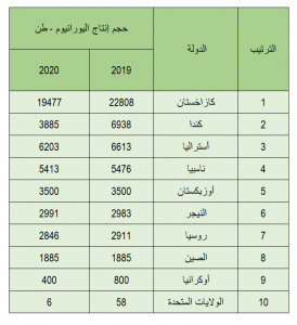 وفيما يلي جدول يظهر أكبر منتجي اليورانيوم في العالم بناء على بيانات الرابطة النووية العالمية: