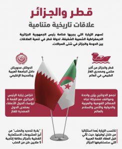 تندرج زيارة الدولة التي يقوم بها فخامة الرئيس عبدالمجيد تبون رئيس الجمهورية الجزائرية الديمقراطية الشعبية الشقيقة إلى دولة قطر، في إطار العلاقات التاريخية المتميزة بين البلدين والحرص المشترك والمتواصل على دعمها والارتقاء بها نحو آفاق أعمق وأشمل، بما يخدم المصالح والأهداف والتطلعات المشتركة للدولتين وشعبيهما الشقيقين.