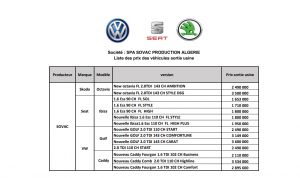 وبلغ سعر “إيبيزا” (1,6) عند الخروج من المصنع ما قيمته 165 مليون سنتيم، مقابل 219 مليون سنتيم في السوق، و”سكودا أوكتافيا” بسعة لترين ما قيمته 249 مليون سنتيم، مقابل 330 مليون سنتيم، و”غولف” بسعة لترين بما قيمته 249 مليون سنتيم، مقابل 340 مليون سنتيم، فيما يبلغ سعر بيكانتو جي ت ياي” بسعر مصنع 181 مليون سنتيم، بينما تباع بـ 235 مليون سنتيم في سوق السيارات.