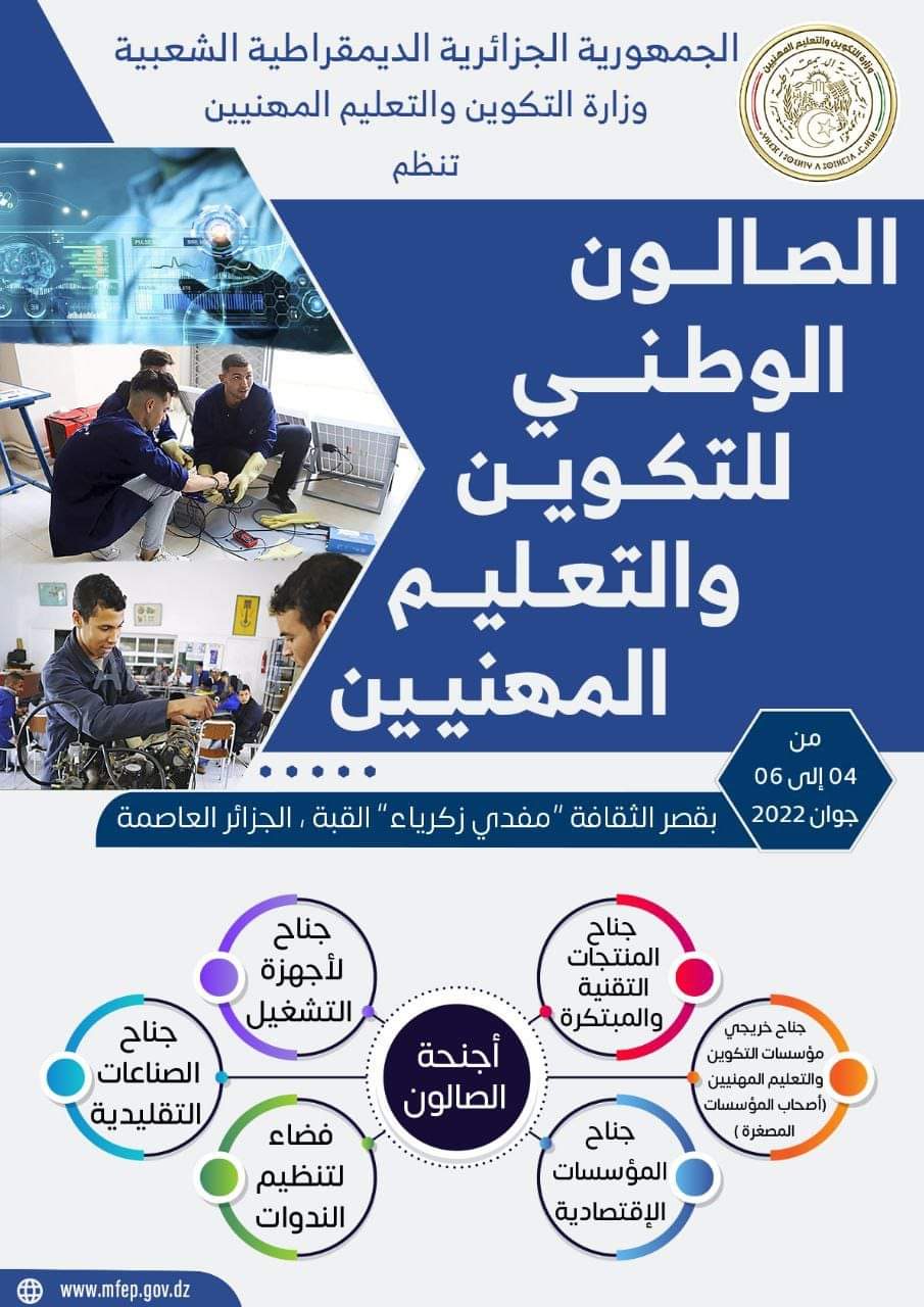 تنظم وزارة التكوين والتعليم المهنيين، الصالون الوطني للتكوين والتعليم المهنيين، وذلك أيام 04، 05، 06 جوان، بقصر الثقافة مفدي زكرياء، وسيشارك في الصالون قرابة 100 عارض، من مؤسسات مصغرة وأصحاب الابتكارات وحرفيين،كما سيعرف برنامج الصالون تنوعا في النشاطات، تشمل محاضرات وندوات مختلفة في مجالات الرقمنة والطاقات المتجددة وغيرها، لتفاصيل أكثر خصصت وزارة التكوين والتعليم المهنيين عبر موقعها الرسمي، صفحة خاصة بالصالون وجميع تفاصيله: