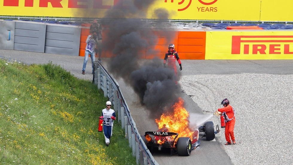 واضطر كارلوس ساينز للخروج من اللفة الـ57 للسباق على حلبة “سبيلبيرغ”، بعد أن خرج الدخان من محرك سيارته، قبل أن تشتعل النيران فيه.