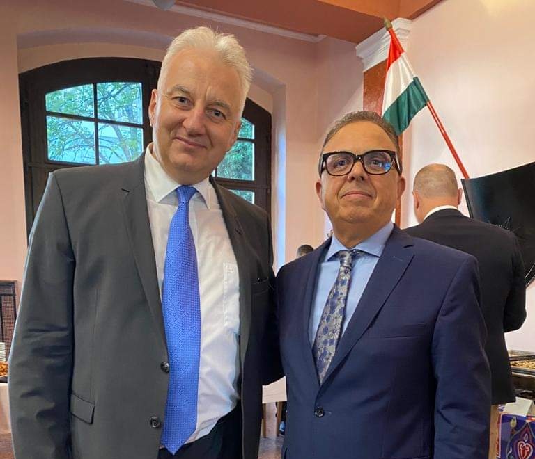 . سعادة السفير علي مقراني مع نائب رئيس الوزراء المجري ، د. السيد Zsolt SEMJÉN ، في حفل استقبال. وقد ناقشا في لقاء سابق فرص وامكانيات تعزيز علاقات الصداقة والتعاون بين الجزائر والمجر بمناسبة مرور 60 عاما على العلاقات الدبلوماسية بين البلدين.