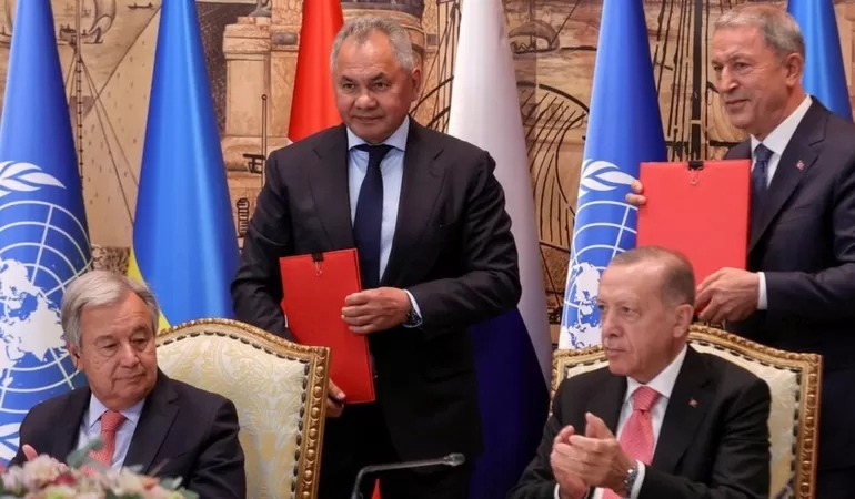 وقّعت روسيا وأوكرانيا في إسطنبول على اتفاقية برعاية الأمم المتحدة وتركيا، تتيح لأوكرانيا إعادة فتح موانئها على البحر الأسود من أجل تصدير الحبوب.