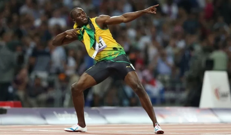 وبولت مشهور عالميا بهذه الحركة المميزة، حيث يميل إلى الوراء ويشير بيده إلى أعلى، وكان دوما يقف على تلك الشاكلة بعد فوزه بميداليات ذهبية وتحقيقه أرقامًا قياسية عالمية.