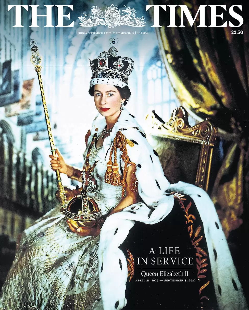 تشير التايمز إلى هذه اللحظة بصورة للملكة من تتويجها عام 1953، إلى جانب عبارة “حياة في الخدمة”. تحتوي الصفحة الخلفية للصحيفة على اقتباس من حديث للملكة بمناسبة عيد الميلاد في عام 1957، وهو أول ما تم بثه على التلفزيون “لا أستطيع أن أقودكم في المعركة. أنا لا أمنحكم القوانين أو أحقق العدالة، لكن يمكنني أن أفعل شيئا آخر: يمكنني أن أعطيكم قلبي وإخلاصي لجميع هذه الجزر العريقة، ولكل شعوب الأمم الشقيقة”