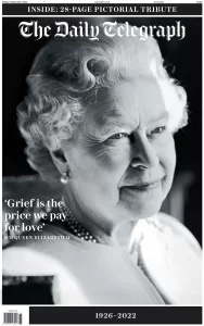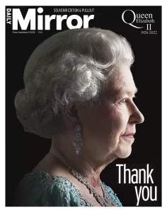 “قلوبنا محطمة”، تقول صحيفة ديلي ميل مع صورة للملكة من عام 1952، عندما كانت الأميرة إليزابيث. “كيف نجد الكلمات؟” تسأل كاتبة العمود في الصحيفة سارة فاين. “حزننا هو مئات المشاعر المختلفة، يصعب استيعابها كلها”