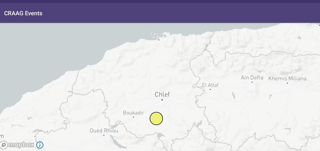 سجل مركز البحث في علم الفلك والفيزياء الفلكية والفيزياء الأرضية، هزة أرضية يوم 15 ديسمبر 2023 على الساعة 22 سا و 57د ، بشدة 3.6 درجات على سلم ريشتر، مركز الهزة حدد ب 4 كم شمال شرق ولاد بن عبد القادر و. شلف.