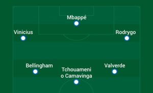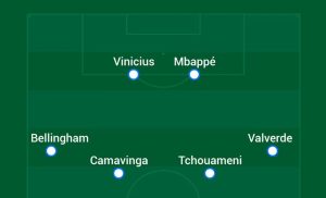 وفي هذه الخطة سيلعب فيديريكو فالفيردي كلاعب خط وسط على الجهة اليمنى، وفي الارتكاز أوريلين تشواميني أو إدواردو كامافينغا، وعلى اليسار جود بيلينغهام.