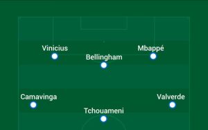 سيضطر أنشيلوتي في هذه الخطة للتضحية بالنجم بالبرازيلي رودريغو لكنه سيحافظ على نفس النهج التكتيكي 4-3-3، بحيث يلعب مبابي على اليمين، وبيلينغهام في قلب الهجوم، وفينيسيوس على اليسار، ويكون خلفهم فالفيردي كلاعب خط وسط على اليمين، وتشواميني كلاعب ارتكاز، وكامافينغا على اليسار.