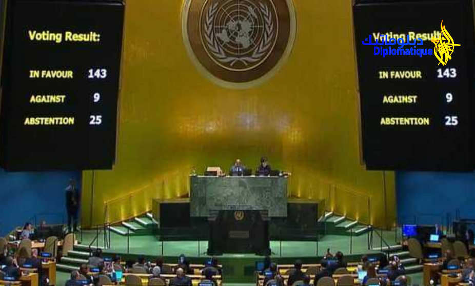 وصوتت لصالح مشروع القرار الذي تقدمت به المجموعة العربية, 143 دولة و امتنعت 25 عن التصويت و رفضت القرار تسعة دول.