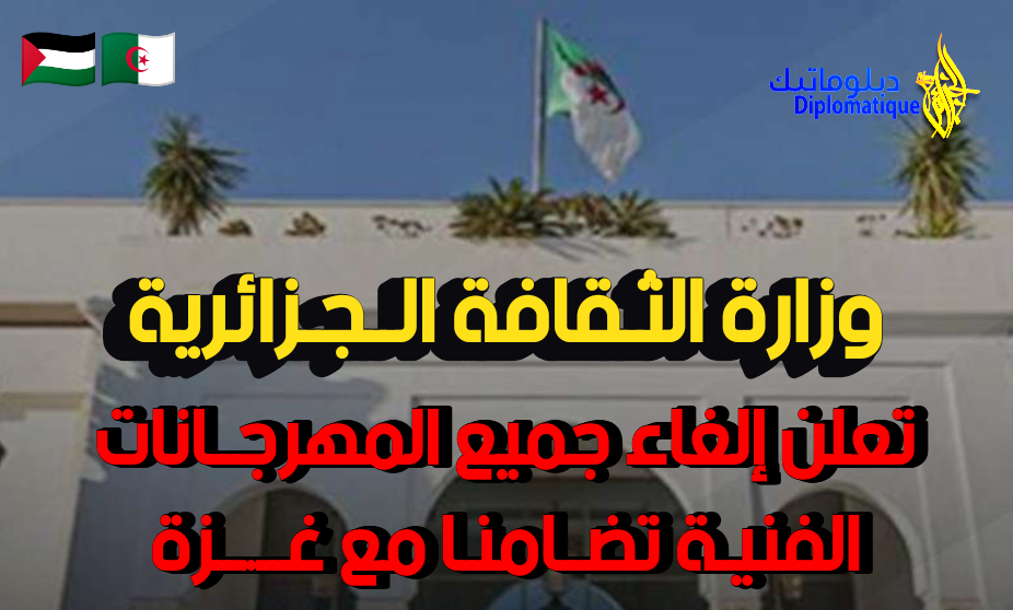 أعلنت وزارة الثـقافة إلغاء جميع المهرجــانات الفنيـة تضــامنـا مع غــ.ــزة الصــامدة ، القرار يأتي تساوقا ومواقف وجهود الدولة الجزائرية لنصرة الشعب الفلسطيني.