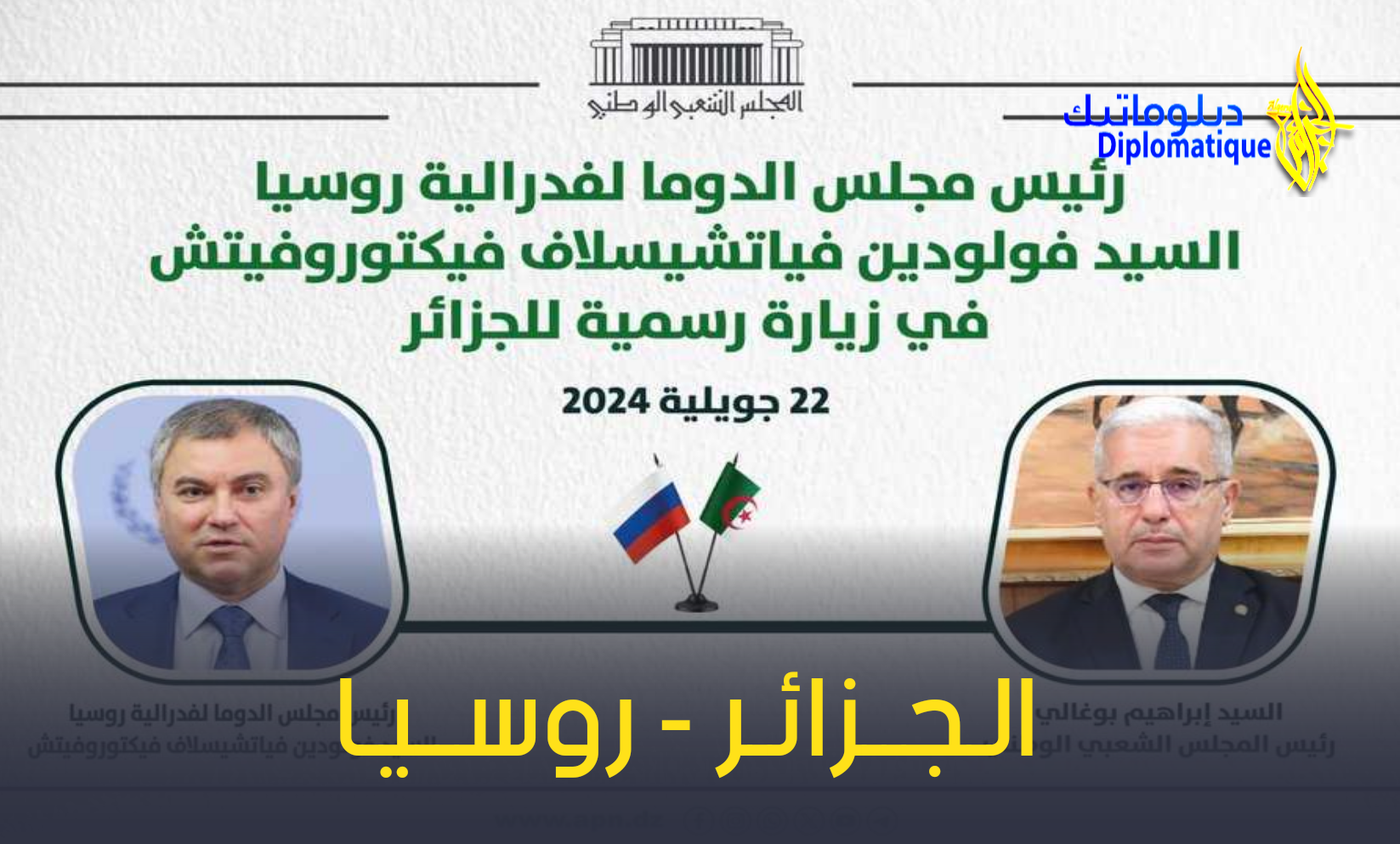 يشرع رئيس مجلس الدوما لفيدرالية روسيا, السيد فولودين فياتشيسلاف فيكتوروفيتش, غدا الإثنين, في زيارة رسمية إلى الجزائر, وفقا لما أورده, اليوم الأحد, بيان للمجلس الشعبي الوطني.