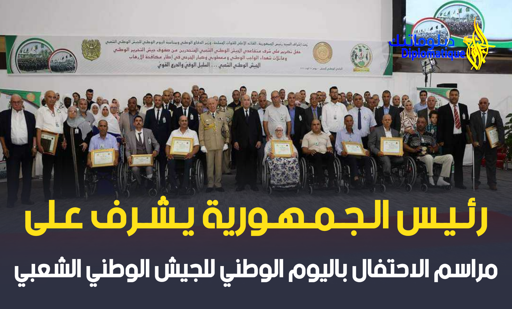 بمناسبة الذكرى الثالثة لليوم الوطني للجيش الوطني الشعبي، أشرف السيد عبد المجيد تبون رئيس الجمهورية القائد الأعلى للقوات المسلحة وزير الدفاع الوطني، اليوم، بالنادي الوطني للجيش ببني مسوس، على مراسم حفل تكريم متقاعدي الجيش الوطني الشعبي المنحدرين من صفوف جيش التحرير الوطني، وكذا عائلات شهداء الواجب الوطني ومعطوبي وكبار الجرحى في إطار مكافحة الإرهاب.