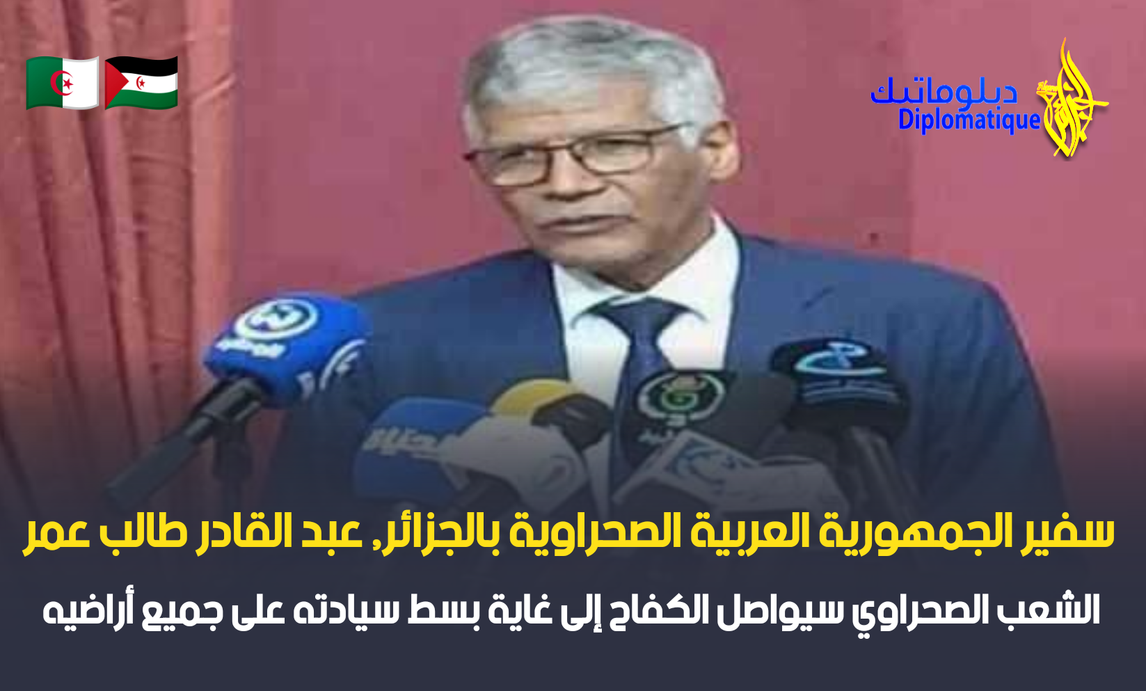 أكد سفير الجمهورية العربية الصحراوية بالجزائر, عبد القادر طالب عمر, اليوم الاثنين, بالجزائر العاصمة, أن الشعب الصحراوي سيواصل الكفاح إلى غاية بسط سيادته على جميع اراضيه المحتلة, مشددا على أن كل مناورات المغرب لتكريس احتلاله للصحراء الغربية لن تنجح لأن الشرعية الدولية تكفل للشعب الصحراوي الحق في تقرير المصير.