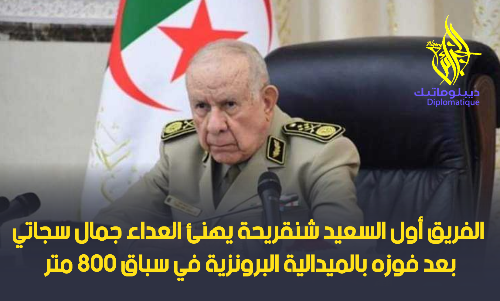 هنأ الفريق أول السعيد شنقريحة رئيس أركان الجيش الوطني الشعبي, اليوم السبت, العداء الجزائري, جمال سجاتي, عقب فوزه بالميدالية البرونزية لسباق 800 متر ضمن الألعاب الأولمبية-2024 الجارية بباريس.