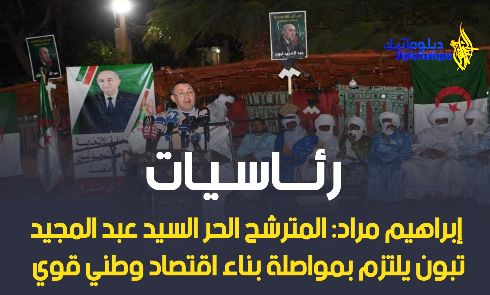 أكد السيد إبراهيم مراد, مدير الحملة الانتخابية للمترشح الحر, السيد عبد المجيد تبون, ليلة أمس الثلاثاء بتمنراست, على إلتزام، السيد عبد المجيد تبون, بمواصلة بناء اقتصاد وطني قوي واستغلال أمثل للثروات الطبيعية.