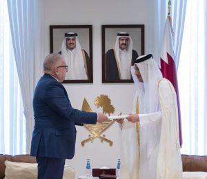 بصفته مبعوثا خاصا لرئيس الجمهوربة، السيد عبد المجيد تبون، سلم الأمين العام لوزارة الشؤون الخارجية والجالية الوطنية بالخارج، السيد لوناس مقرمان، صباح اليوم الثلاثاء بالدوحة، الى معالي رئيس مجلس الوزراء ووزير الخارجية بدولة قطر الشقيقة، الشيخ محمد بن عبدالرحمن بن جاسم آل ثاني، رسالة خطية موجهة من السيد رئيس الجمهورية إلى أخيه حضرة صاحب السمو أمير دولة قطر، الشيخ تميم بن حمد آل ثاني،