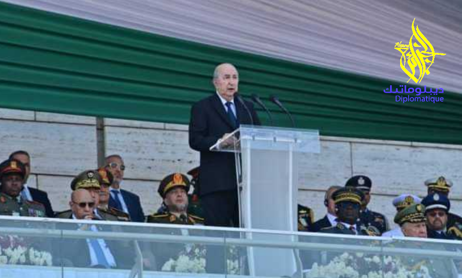 وقبل ذلك, وعلى وقع الموسيقى العسكرية وطلقات المدفعية, قام رئيس الجمهورية, مرفوقا برئيس أركان الجيش الوطني الشعبي, الفريق أول السعيد شنقريحة, بتفتيش المربعات المشاركة في هذا الاستعراض, والتي تمثل كافة قوات الجيش الوطني الشعبي.