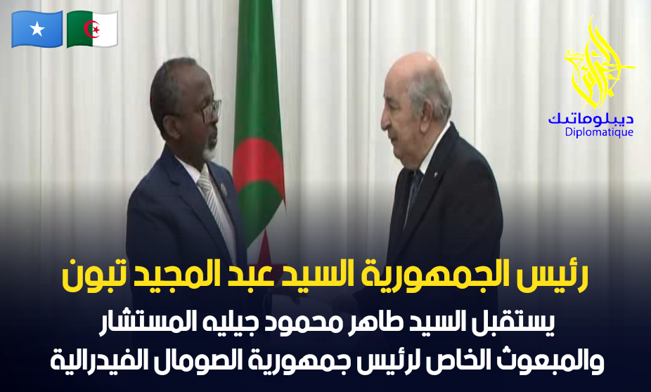 استقبل، رئيس الجمهورية السيد عبد المجيد تبون، اليوم، السيد طاهر محمود جيليه المستشار والمبعوث الخاص لرئيس جمهورية الصومال الفيدرالية، حاملا منه رسالة خطية، إلى السيد رئيس جمهورية.