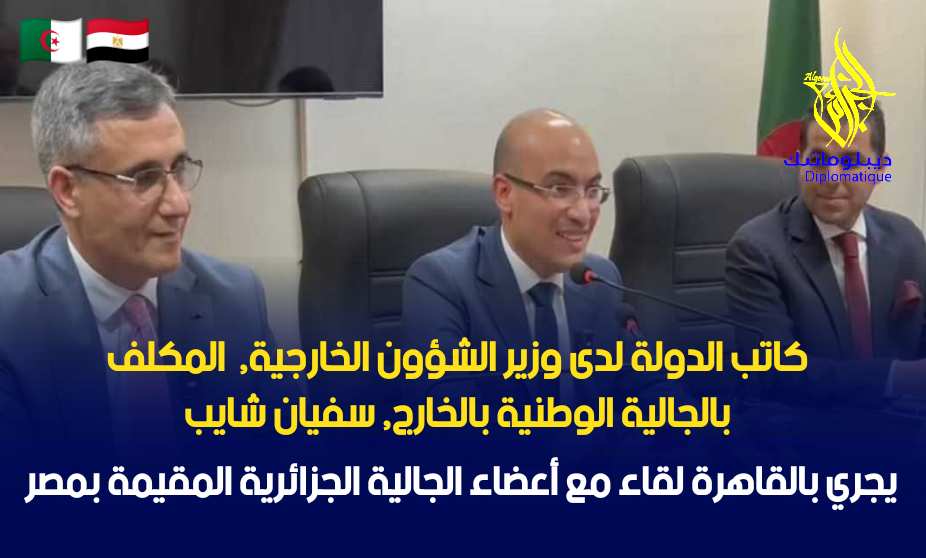 أجرى كاتب الدولة لدى وزير الشؤون الخارجية, المكلف بالجالية الوطنية بالخارج, سفيان شايب, اليوم الثلاثاء بالقاهرة, لقاء جمعه مع أعضاء من الجالية الجزائرية المقيمة بجمهورية مصر العربية الشقيقة, حسب ما افاد به بيان لوزارة الشؤون الخارجية والجالية الوطنية بالخارج والشؤون الإفريقية.