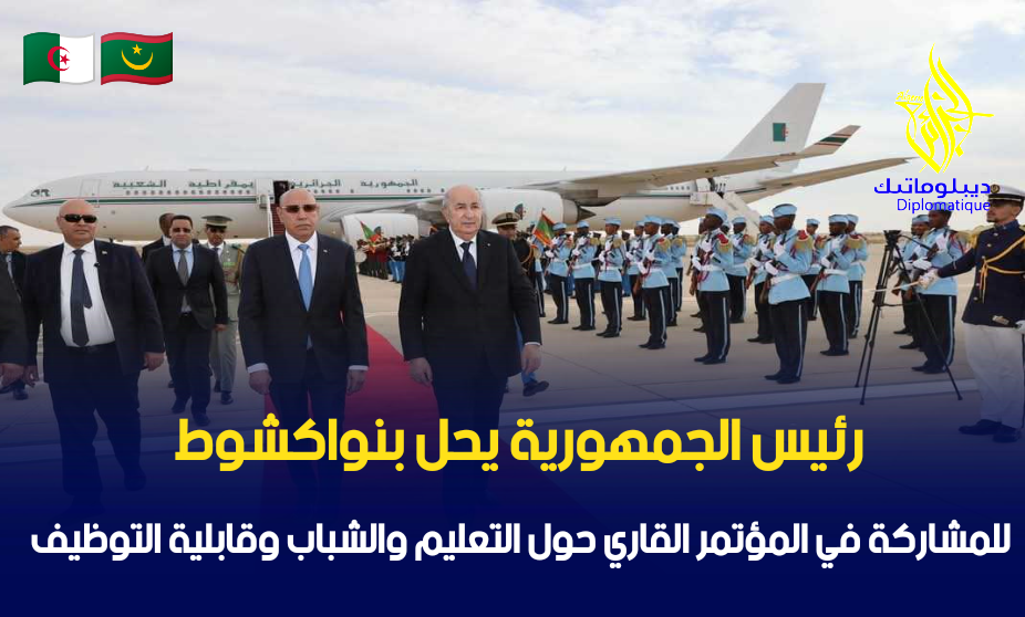 حل رئيس الجمهورية, السيد عبد المجيد تبون, اليوم الاثنين, بالعاصمة الموريتانية نواكشوط, للمشاركة في المؤتمر القاري حول التعليم والشباب وقابلية التوظيف.