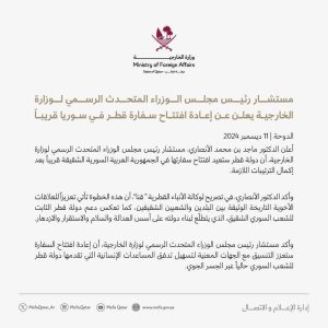 وأكد الأنصاري في تصريح لوكالة الأنباء القطرية “قنا” أن هذه الخطوة تأتي ” للعلاقات الأخوية التاريخية الوثيقة بين البلدين والشعبين الشقيقين، كما تعكس دعم دولة قطر الثابت للشعب السوري الشقيق، الذي يتطلّع لبناء دولته على أسس العدالة والسلام والاستقرار والازدهار”.