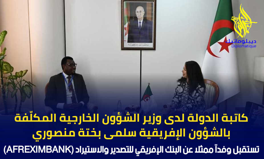 استقبلت كاتبة الدولة لدى وزير الشؤون الخارجية، المكلّفة بالشؤون الإفريقية، السيدة سلمى بختة منصوري، اليوم، بمقر الوزارة، وفداً ممثلا عن البنك الإفريقي للتصدير والاستيراد (AFREXIMBANK)، بمناسبة مشاركته في فعاليات الطبعة الـ 32 لمعرض الإنتاج الجزائري.