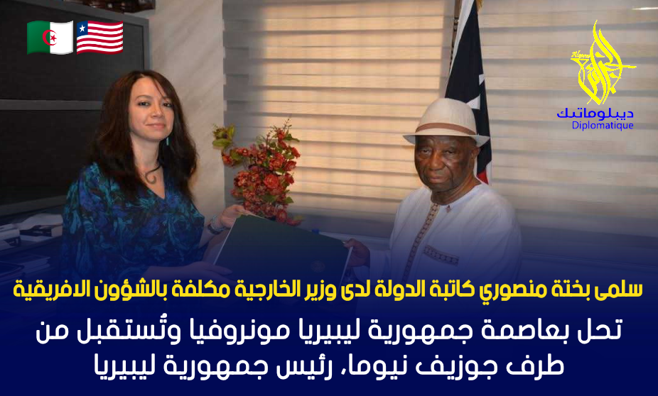 حلت السيدة سلمى بختة منصوري، كاتبة الدولة لدى وزير الخارجية مكلفة بالشؤون الافريقية، بعاصمة جمهورية ليبيريا مونروفيا، أين استقبلت من طرف السيد جوزيف نيوما، رئيس جمهورية ليبيريا.