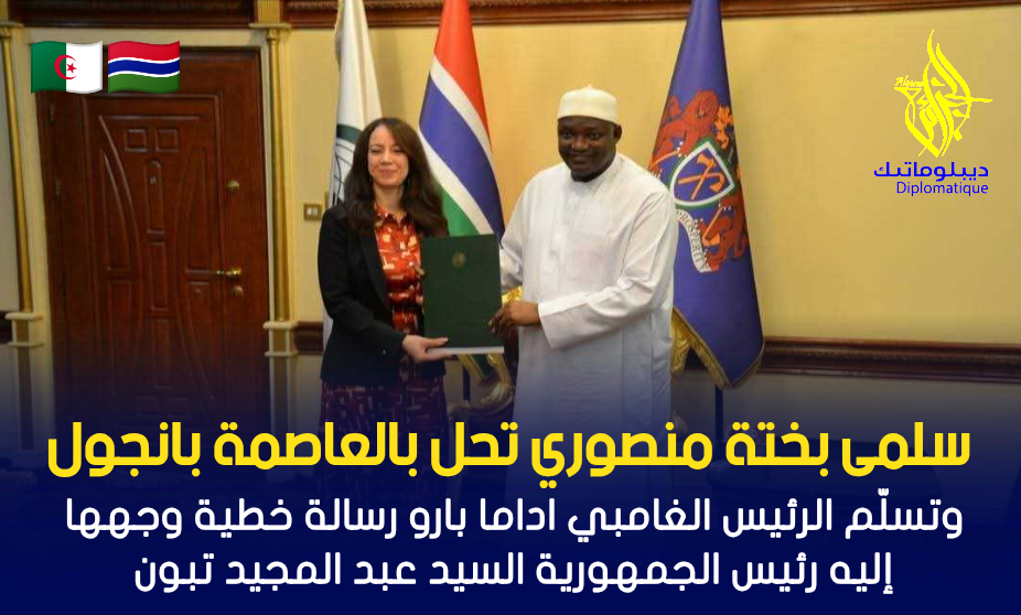 حلت السيدة سلمى بختة منصوري، كاتبة الدولة لدى وزير الشؤون الخارجية مكلفة بالشؤون الافريقية، بالعاصمة بانجول، أين سلمت للرئيس الغامبي، السيد اداما بارو، رسالة خطية وجهها إليه رئيس الجمهورية، السيد عبد المجيد تبون.