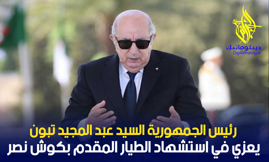 تقدم رئيس الجمهورية, القائد الأعلى للقوات المسلحة, وزير الدفاع الوطني, السيد عبد المجيد تبون, بخالص التعازي وعميق المواساة لأسرة الشهيد وللجيش الوطني الشعبي, اثر استشهاد الطيار المقدم بكوش نصر اليوم الأربعاء في حادث تحطم طائرة عسكرية بولاية أدرار.