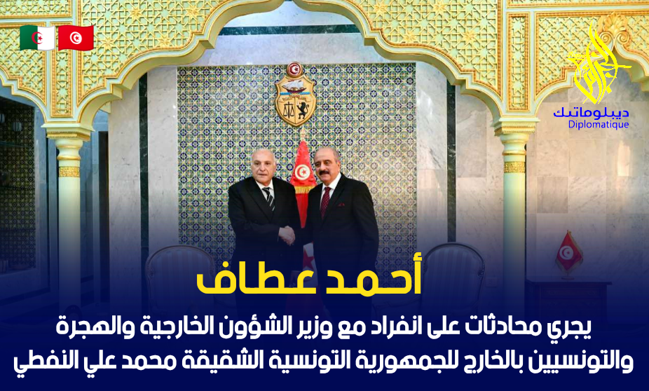 أحمد عطاف يجري مُحادثات على انفراد مع وزير الشؤون الخارجية والهجرة والتونسيين بالخارج للجمهورية التونسية الشقيقة محمد علي النفطي