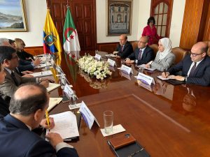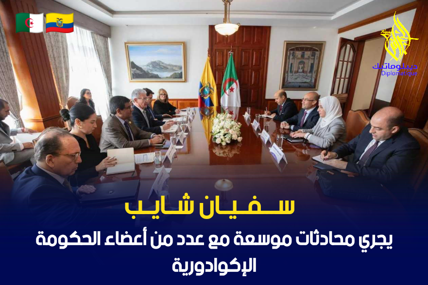 بمناسبة مشاركته بصفته ممثلا لرئيس الجمهورية، السيد عبد المجيد تبون، في مراسم تنصيب الرئيس الإكوادوري المنتخب التي أقيمت يومي 23 و 24 ماي 2025، أجرى كاتب الدولة لدى وزير الشؤون الخارجية، المكلف بالجالية الوطنية بالخارج، السيد سفيان شايب، محادثات موسعة مع عدد من أعضاء الحكومة الإكوادورية ممثلين في كل من؛ وزير الفلاحة وتربية المواشي ووزير الإنتاج والتجارة الخارجية والاستثمار والصيد البحري علاوة على كل من نائبي وزيري العلاقات الخارجية والتجارة الخارجية.