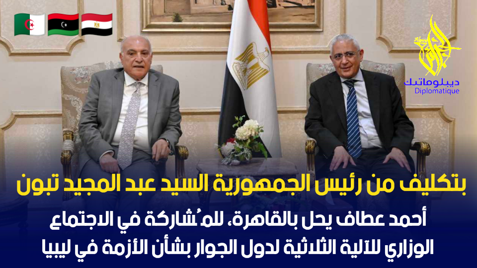 بتكليف من السيّد رئيس الجمهورية، حلّ وزير الدولة، وزير الشؤون الخارجية والجالية الوطنية بالخارج والشؤون الإفريقية، السيّد أحمد عطاف، مساء اليوم بالقاهرة، للمُشاركة في الاجتماع الوزاري للآلية الثلاثية لدول الجوار بشأن الأزمة في ليبيا، المزمع عقده يوم الغد.