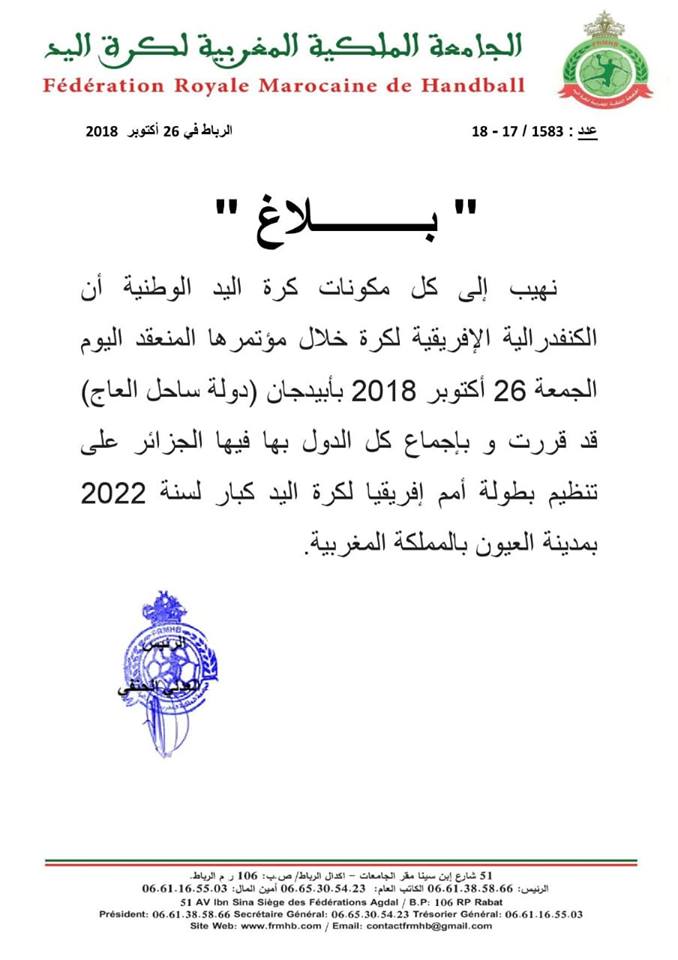 كما صنع نص بيان منسوب للاتحاد المغربي الحدث، أمس، تحت رقم 1583/ 17-18 بعدما جاء فيه بصريح العبارة أن “الكنفدرالية الإفريقية لكرة اليد قد قررت بإجماع كل الدول بما فيها الجزائر على تنظيم بطولة إفريقيا للكبار لسنة 2022 بمدينة العيون..”.