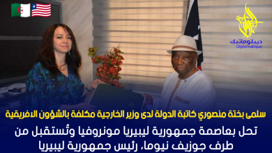 سلمى بختة منصوري تحل بعاصمة جمهورية ليبيريا مونروفيا وتُستقبل من طرف جوزيف نيوما، رئيس جمهورية ليبيريا